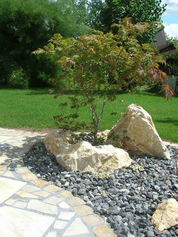 Typische Solitärgehölze sind: Kugelahorn, Säulenahorn, Ginkobaum, Thuja, Zypresse, Kiefer, Zaubernuss, Schneeball, Eibe und Gross-Stauden wie mehrjährige Sonnenblumen oder Ziergräser.
