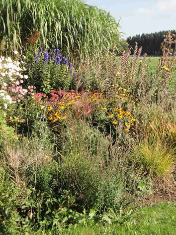 Als Mixed Borders bezeichnet man Beete, die sich oft gegenüberliegen, in denen Stauden, Gräser, Ziersträucher, aber auch Sommerblumen und Zwiebelgewächse gepflanzt sind. Auf einem breiten Rasenweg kann man flanieren und die Farbenpracht von Blüten und Blättern geniessen.