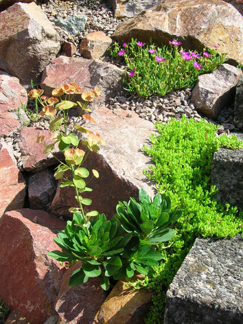 Die typische Bepflanzung von Steingärten umfasst Gräser, kleinwüchsige Gehölze, Gebirgspflanzen und Polsterstauden. Aber auch einige Sukkulenten passen aufgrund Ihrer zurückhaltenden Natur in einen Steingarten.